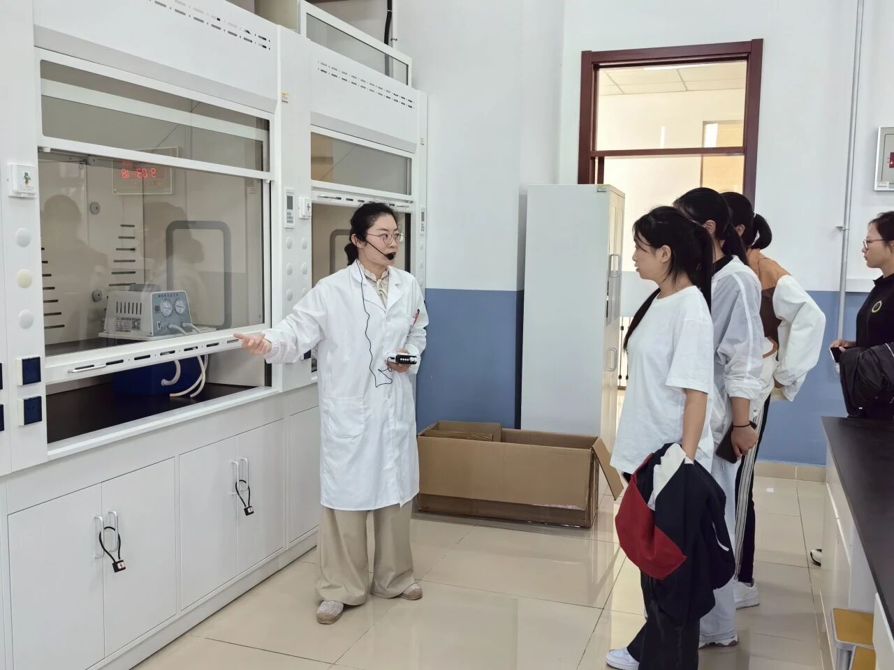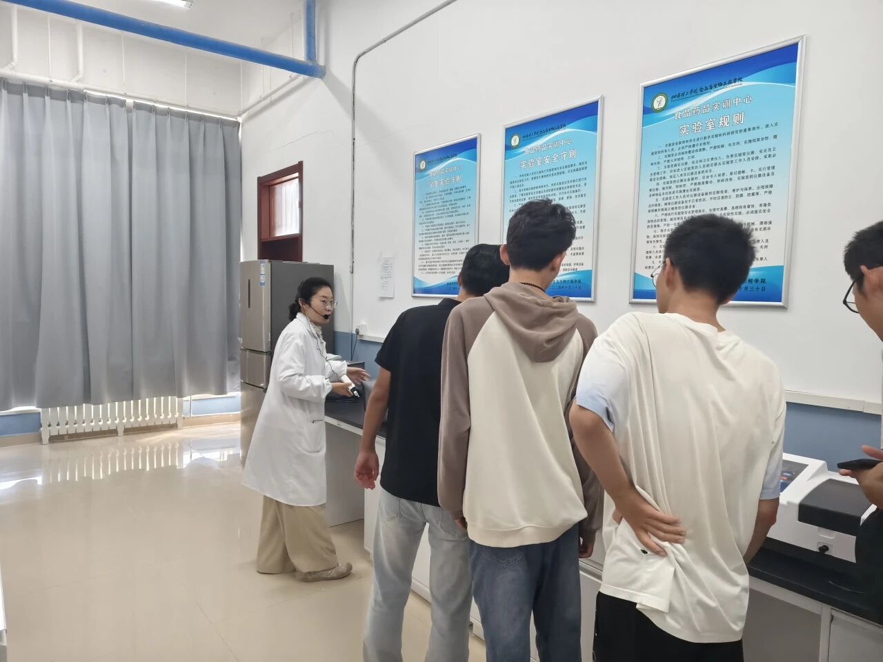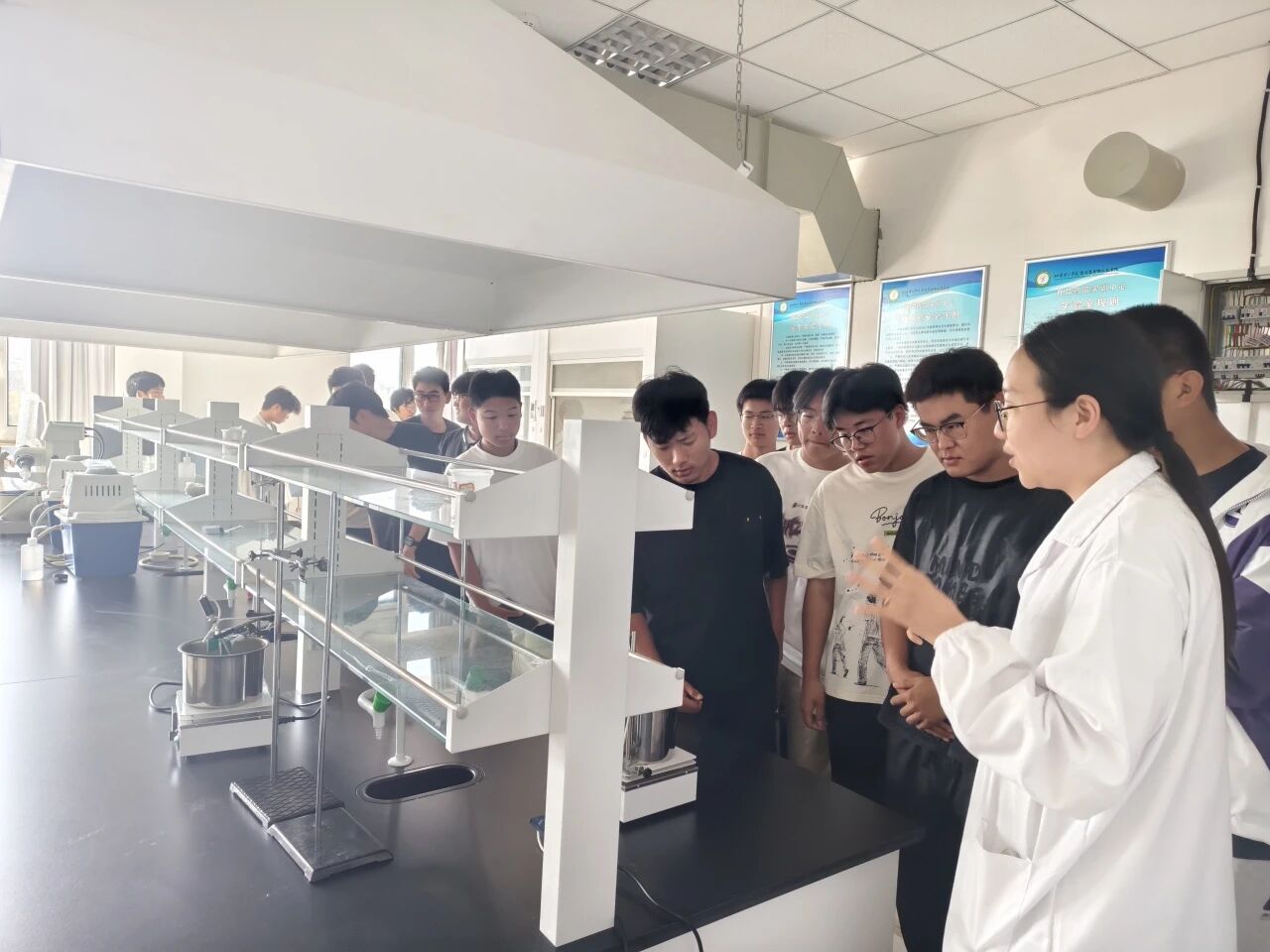在学院专业教师团队的带领下,同学们依次参观了工艺实验室、生物工程综合实验室、果酒综合实验室、食品安全与分析实验室、生物与药理实验室、分光光度室、天平室等多个教学科研场所。老师们就实验室功能、主要设备、研究方向及与专业课程的衔接关系等内容进行了系统讲解,并结合实际案例介绍了相关技术在食品加工、微生物发酵、食品质量评估等领域的应用。