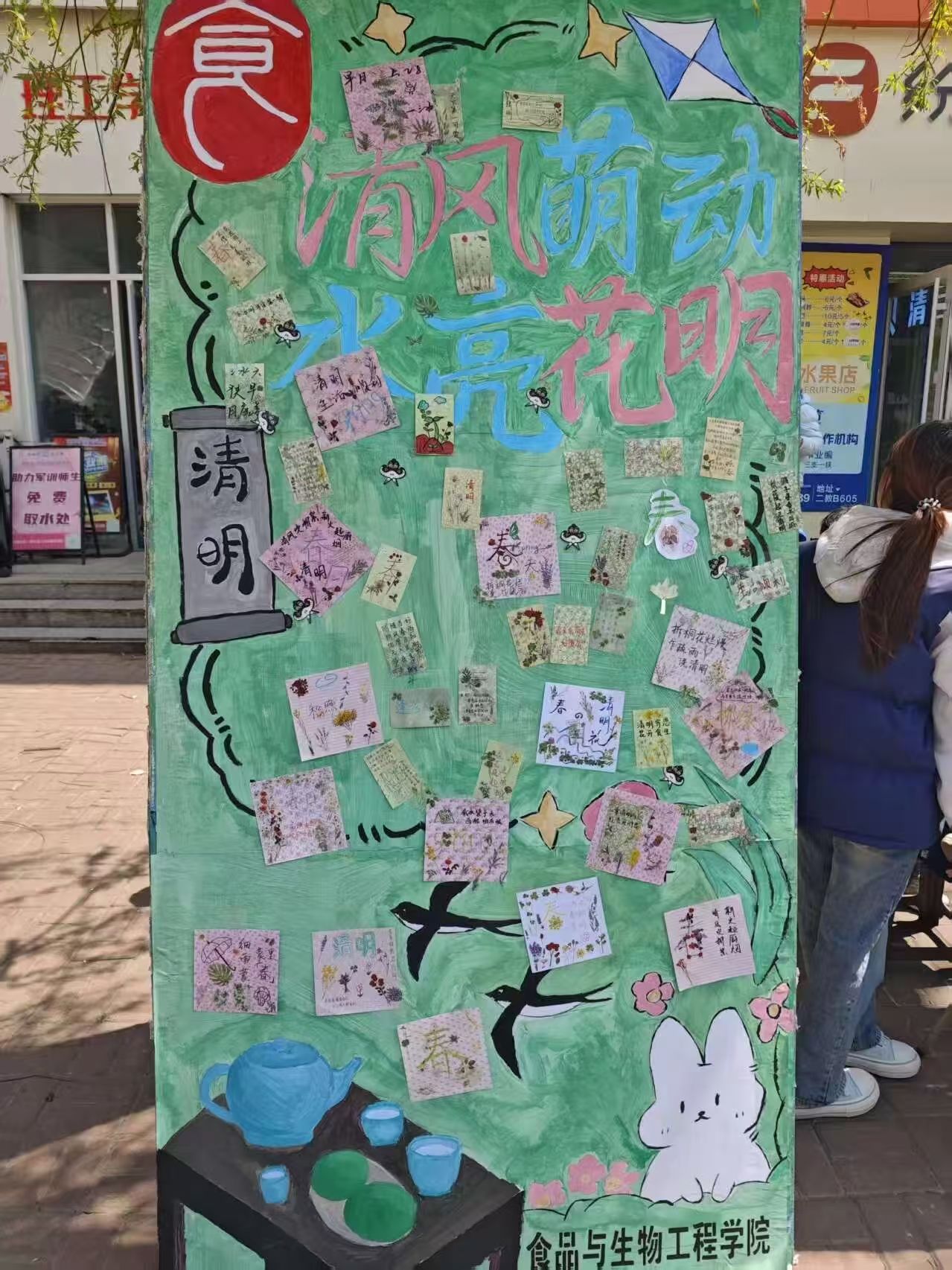 活动伊始,同学们驻足阅读清明文化科普内容,系统了解节日的起源脉络、发展历程与经典传统习俗,深刻领会清明节慎终追远、缅怀先辈,同时踏春赏景、亲近自然的双重文化意蕴。进入创意创作环节,大家精心挑选植物贴画素材,搭配彩笔在背景纸上尽情发挥创意,以画笔为媒、以贴画为介,将清明时节草木抽芽、繁花竞放的春日盛景定格于纸面,每一幅作品都承载着对春日美景的由衷喜爱,也凝聚着对传统节气文化的真切感悟。创作结束后,同学们参与趣味奖品抽卡活动,收获精美钥匙扣挂件,纷纷与主题板报、原创手工作品合影留念,定格春日里的文化美好瞬间。