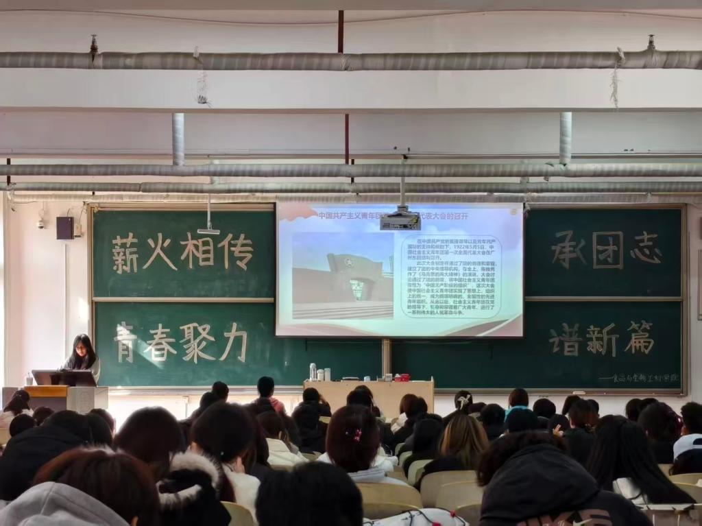 为进一步引导广大青年厚植爱国情怀,涵养进取品格,11月12日和11月13日中午,食品与生物工程学院于一教206开展“薪火相传承团志,青春聚力谱新篇”主题团课。团课培训伊始,团总支学生干部王羽彤同学采用“理论阐释+历史影像”相结合的方式,带领青年团员一同重温共青团百年奋斗征程。从五四运动中觉醒的青年力量,到新中国建设时期的垦荒拓土,再到新时代里青年在科技攻关、志愿服务等领域的担当作为,让同学们深为进一步引导广大青年厚植爱国情怀,涵养进取品格,11月12刻领会共青团紧跟时代步伐、勇担家国使命,与祖国共赴征程的责任与担当。随后,王羽彤同学还分享了学习到的入团誓词深刻内涵以及共青团的组织原则、奋斗目标等核心知识,进一步强化了大家的身份认同感。